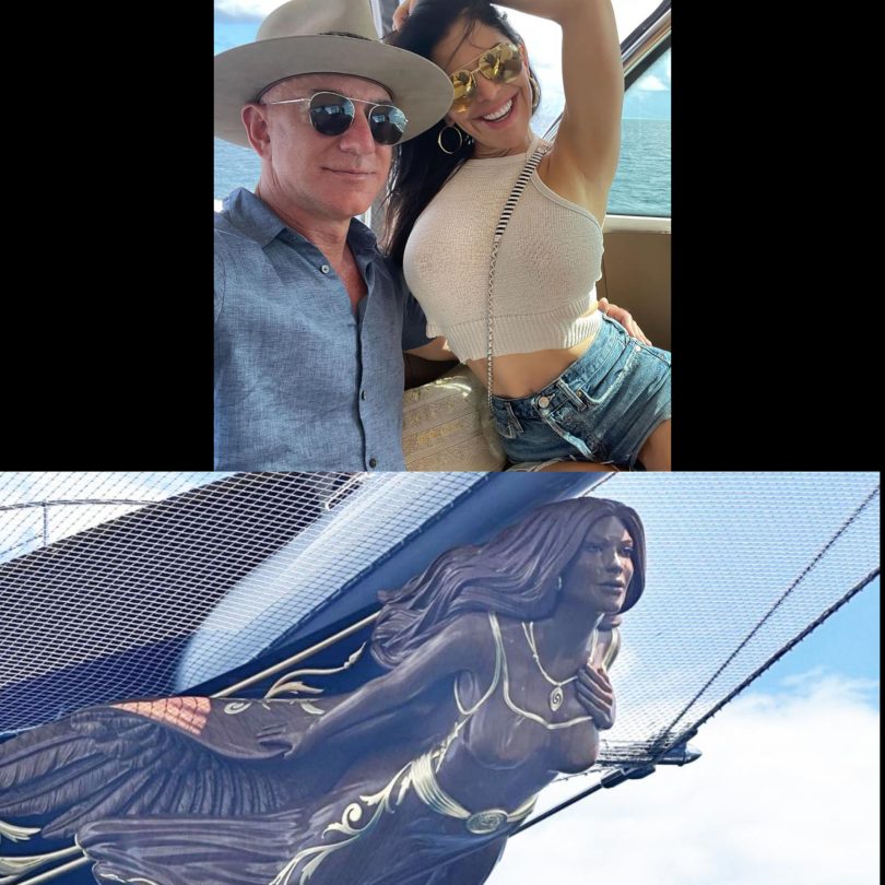 Jeff Bezos’s 417 foot luxury superyacht appears to have a wooden figurehead that bears a striking resemblance to Lauren Sanchez, his girlfriend.