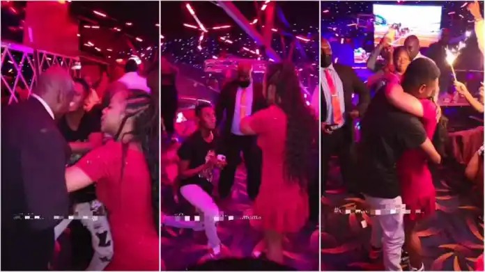videos from the romantic scene, termed a unique proposal, have been circulating online and show the lady, in a red dress, trying to fight off bouncers, mishandling her boyfriend.