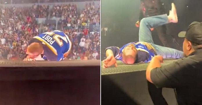 As the singer was performing his hit song ‘circles’, he failed to see a hole which was inconveniently located in the middle of the stage, and consequently fell over.