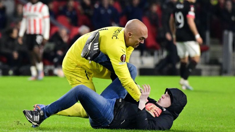 The incident occurred during the final few minutes of their Europa League clash, which Sevilla won 3-2 on aggregate. The pitch invader, believed to be a PSV fan stormed the pitch and appeared to throw a punch at Marko Dmitrovic before the Serbian stopper retaliated.
