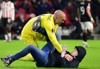 Sevilla goalkeeper fights pitch invader and pins him...