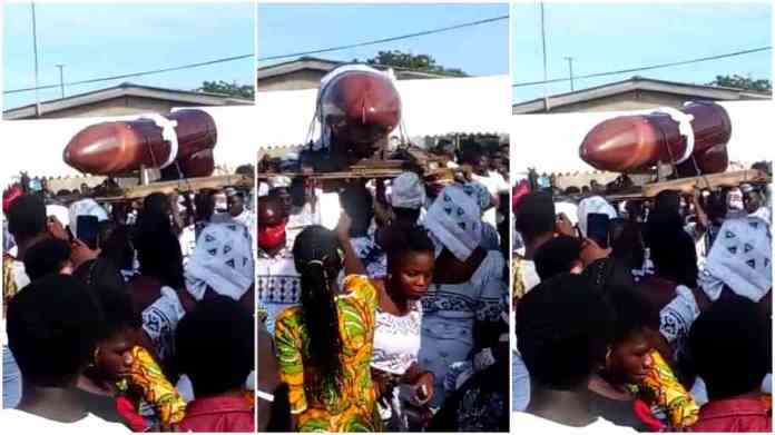 A video has surfaced on social media in which a deceased is being buried in a pєŋis-shaped coffin.