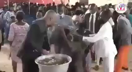 In the video, the Pastor was seen scooping water into his mouth from a bowl and spitting it on his members as they walk by.