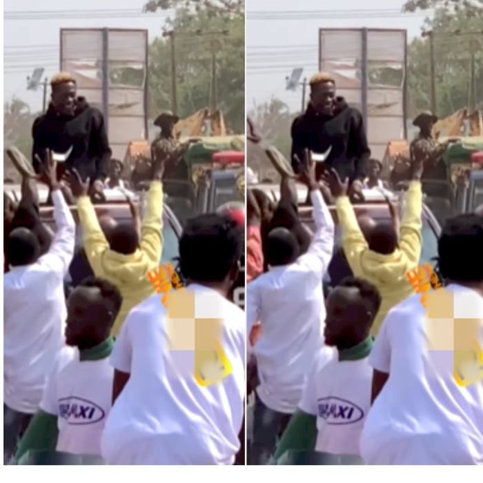 The ‘On God’ hitmaker is in the region for a concert and drove through the streets of Berekum to the concert venue.